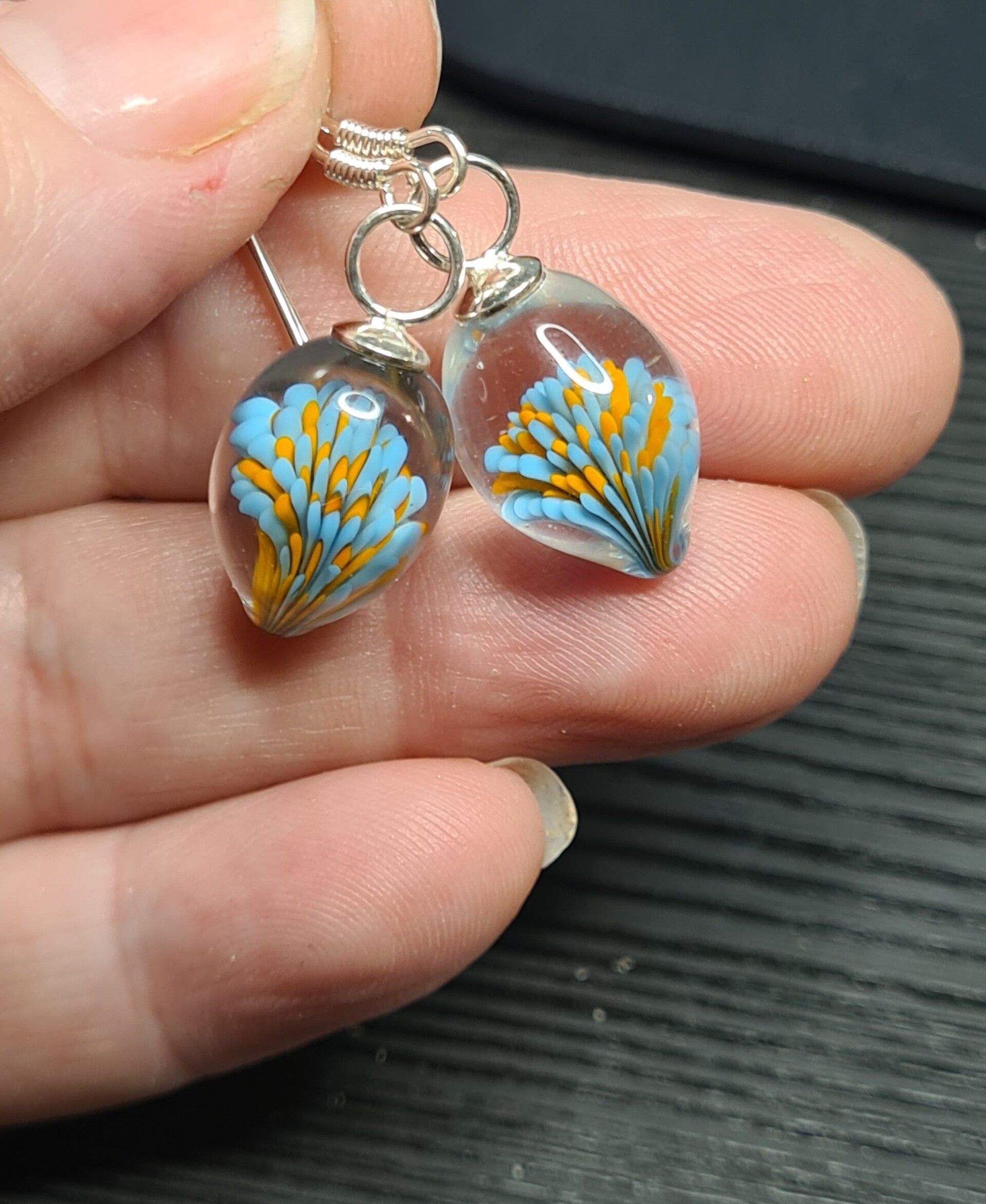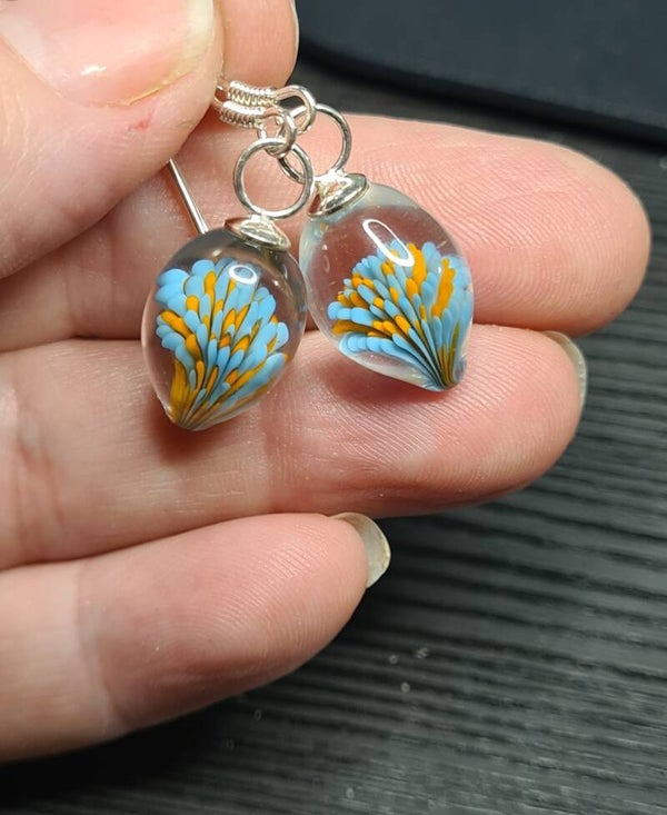 Oorbellen in druppelvorm. In aquablauw en oranje.