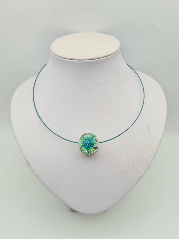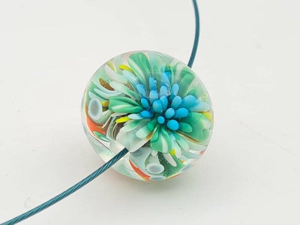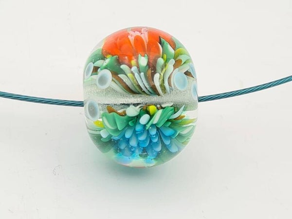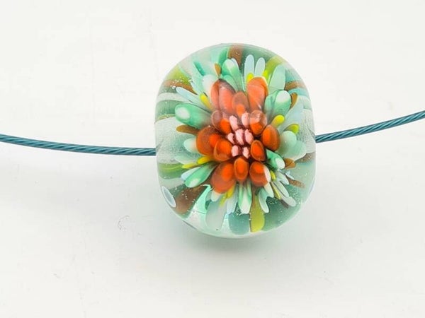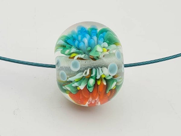 One bead, two imlosions. A bead with two different sides in aqua blue, different green colors, orange and a little bit of brown.
