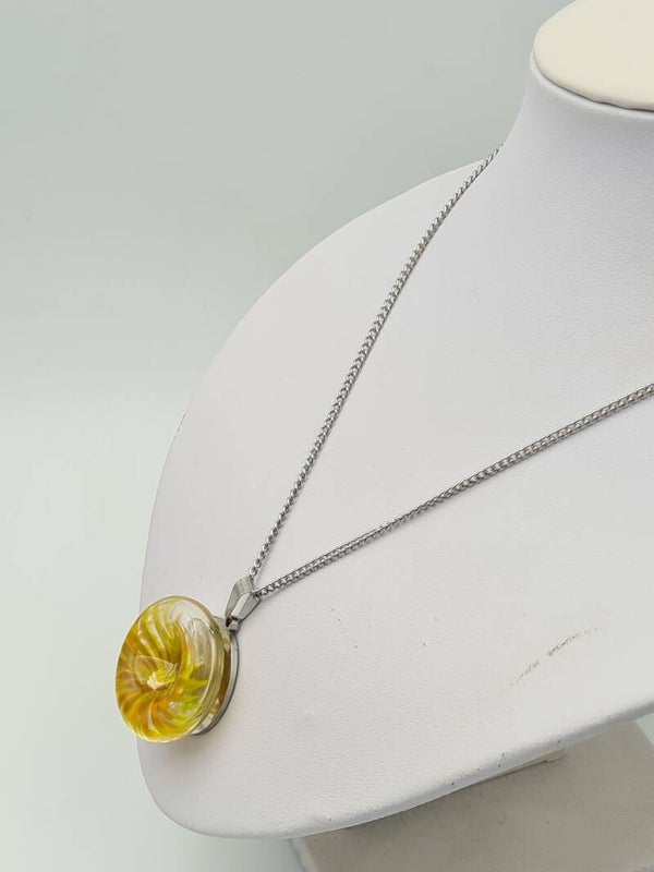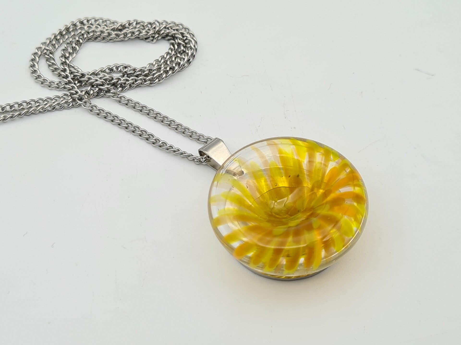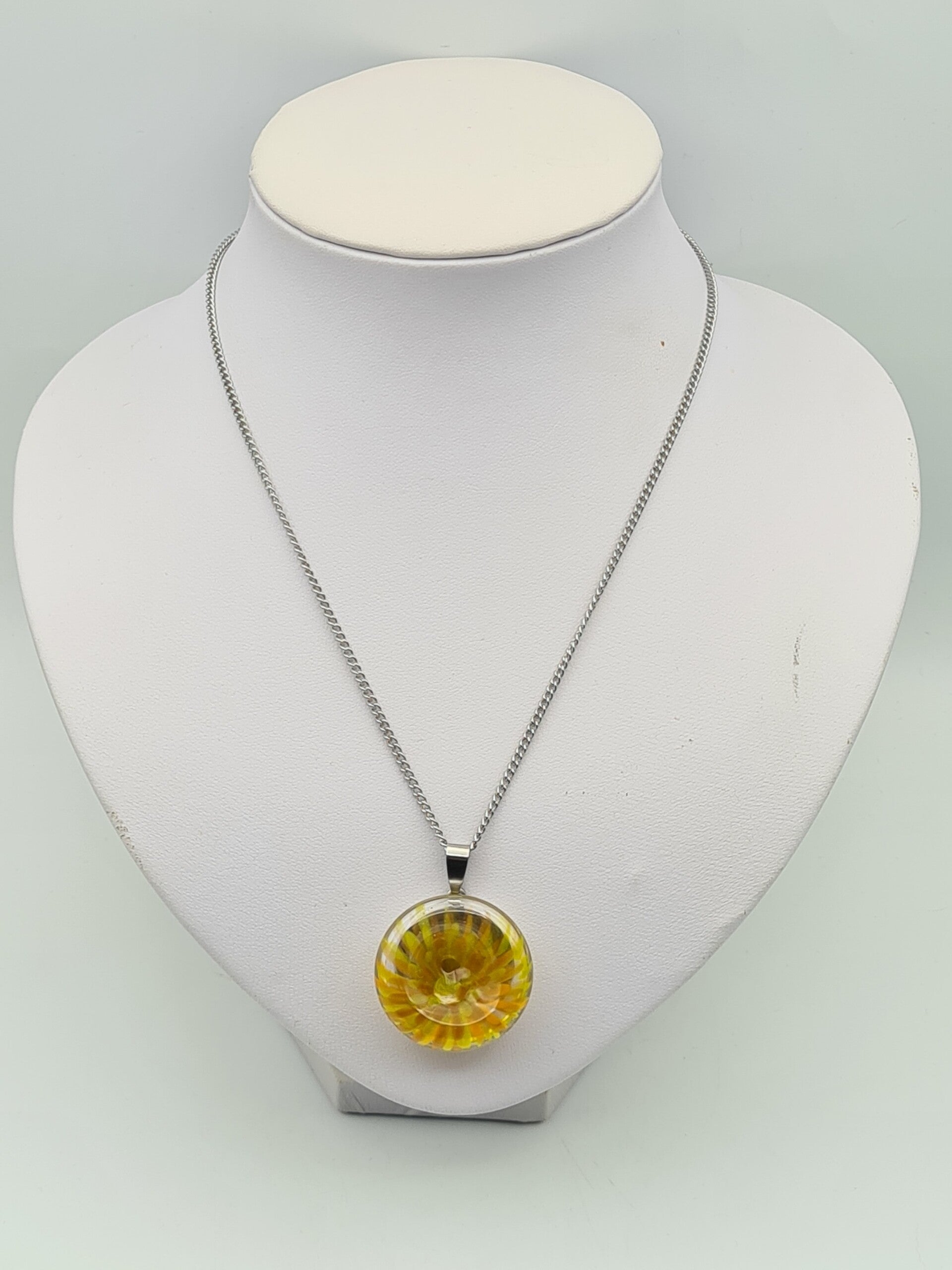 A necklace in Ibiza style. In yellow, brown and a little bit of orange. The hollow bead has a 3D patorn. The bead is mounted on a stainless steel pendant including a Stainless Steel necklace. Fits perfectly with ibiza style clothing in summer.