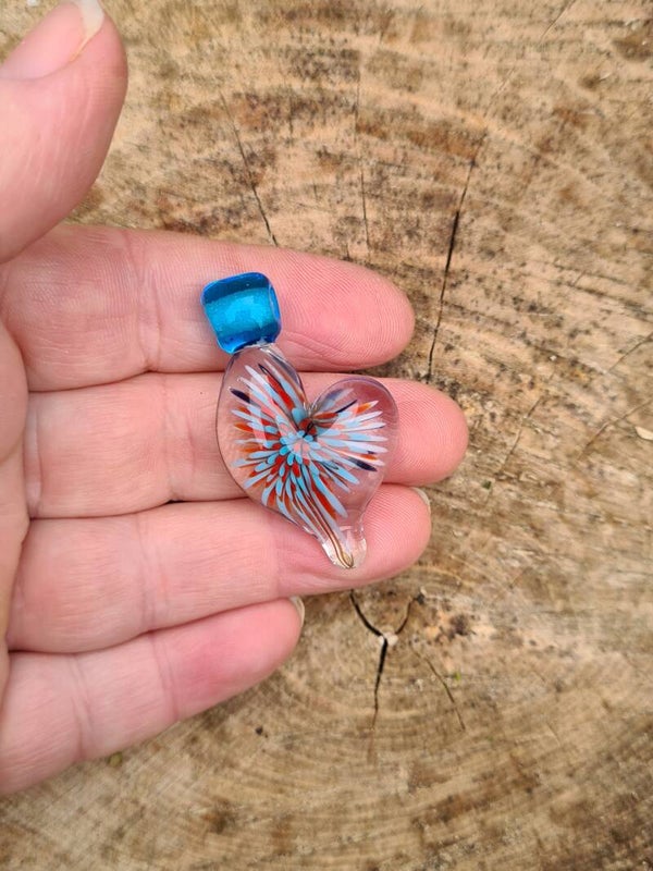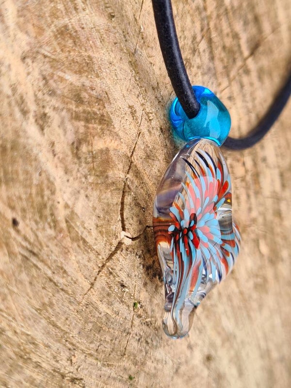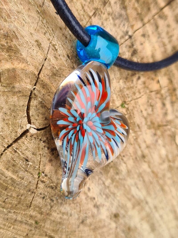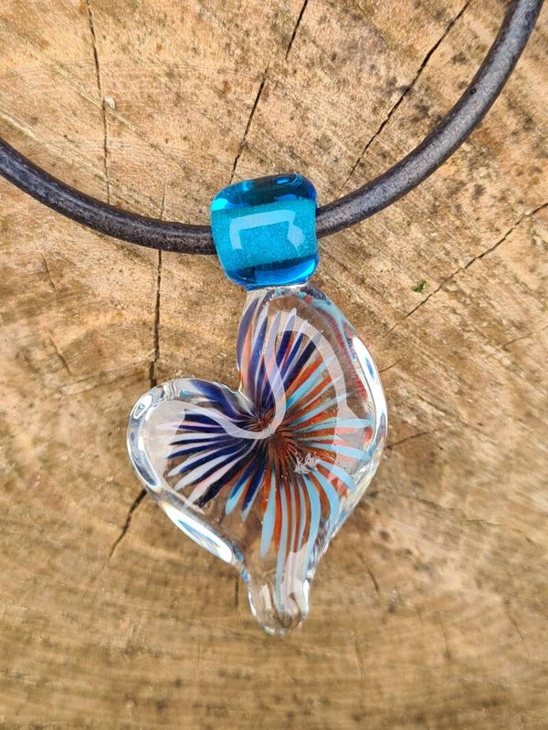 Hart hanger in blauw, rood en beetje zwart en wit. Zwart leren ketting met RVS (karabijn) sluiting.