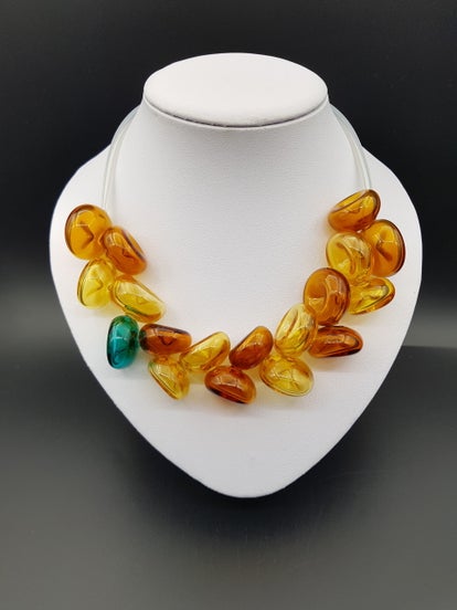 A handmade necklace with 18 hollow beads in topaz brown, topaz yellow and green.