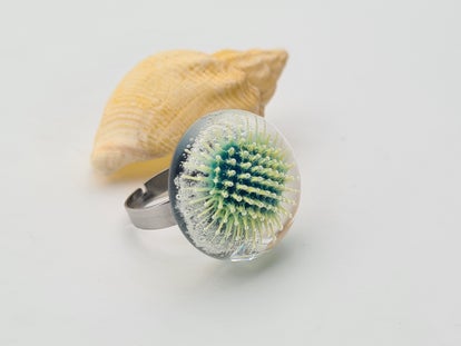 Ring in rose, blauw en verschillende kleuren groen en een rose achtergrond.