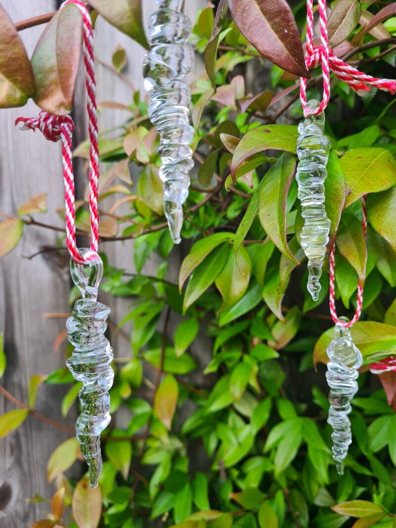 Alvast een kleine voorbereiding op de koude wintermaanden. Je eigen ijspegels maken voor in de kerstboom. ijspegels met een oogje aan de bovenkant om een touwtje of een lintje door te steken voor het ophangen.